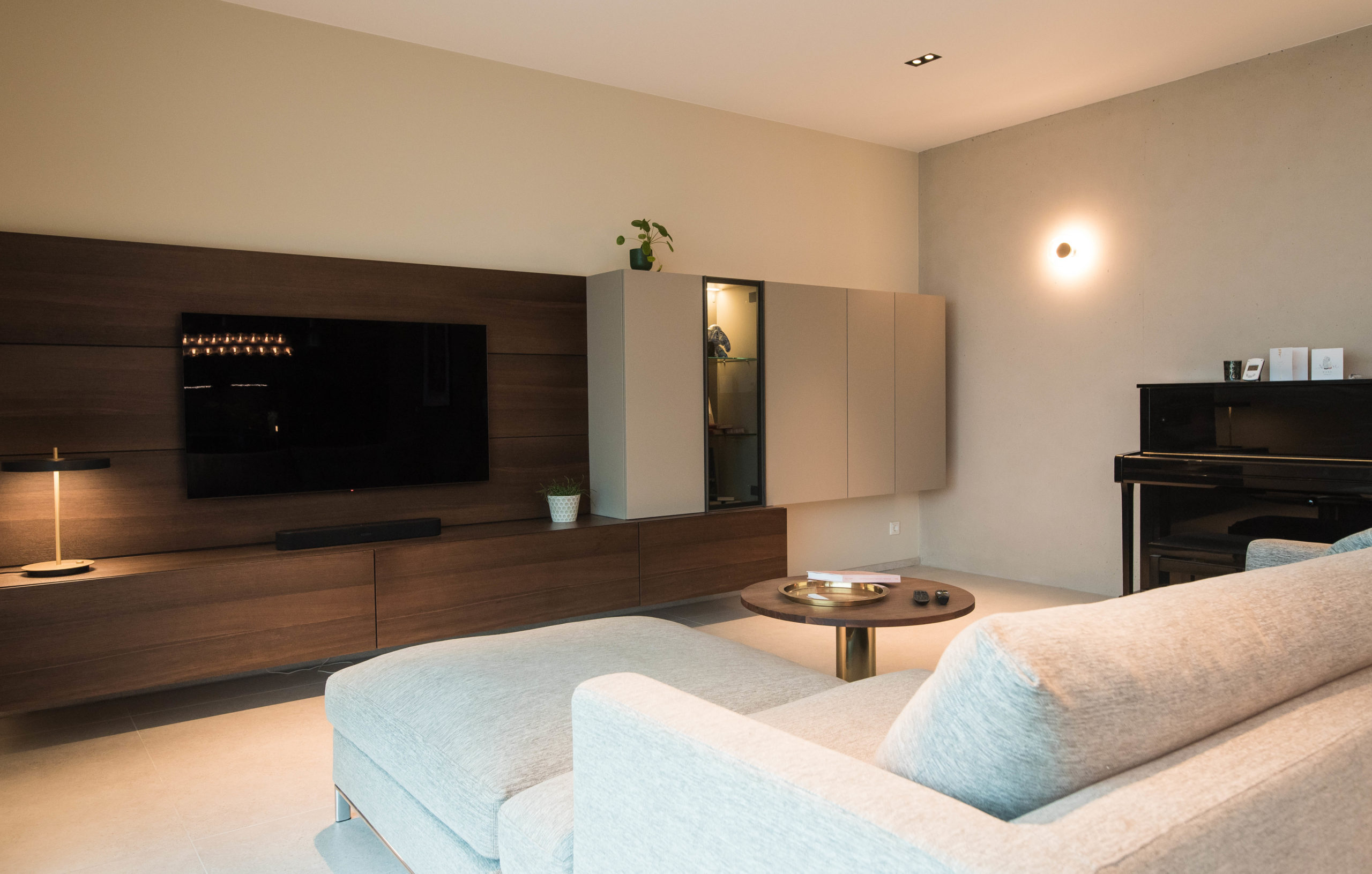 Le meuble de l’espace salon est suspendu pour apporter de la légèreté et design à l’ensemble de l’aménagement intérieur. Il est réalisé dans le même bois que les meubles de la cuisine, toujours dans l’idée de créer un fil rouge à cette enfilade d’espaces. Le reste du meuble est laqué gris taupe afin de sortir progressivement des tons sombres tout en équilibre.