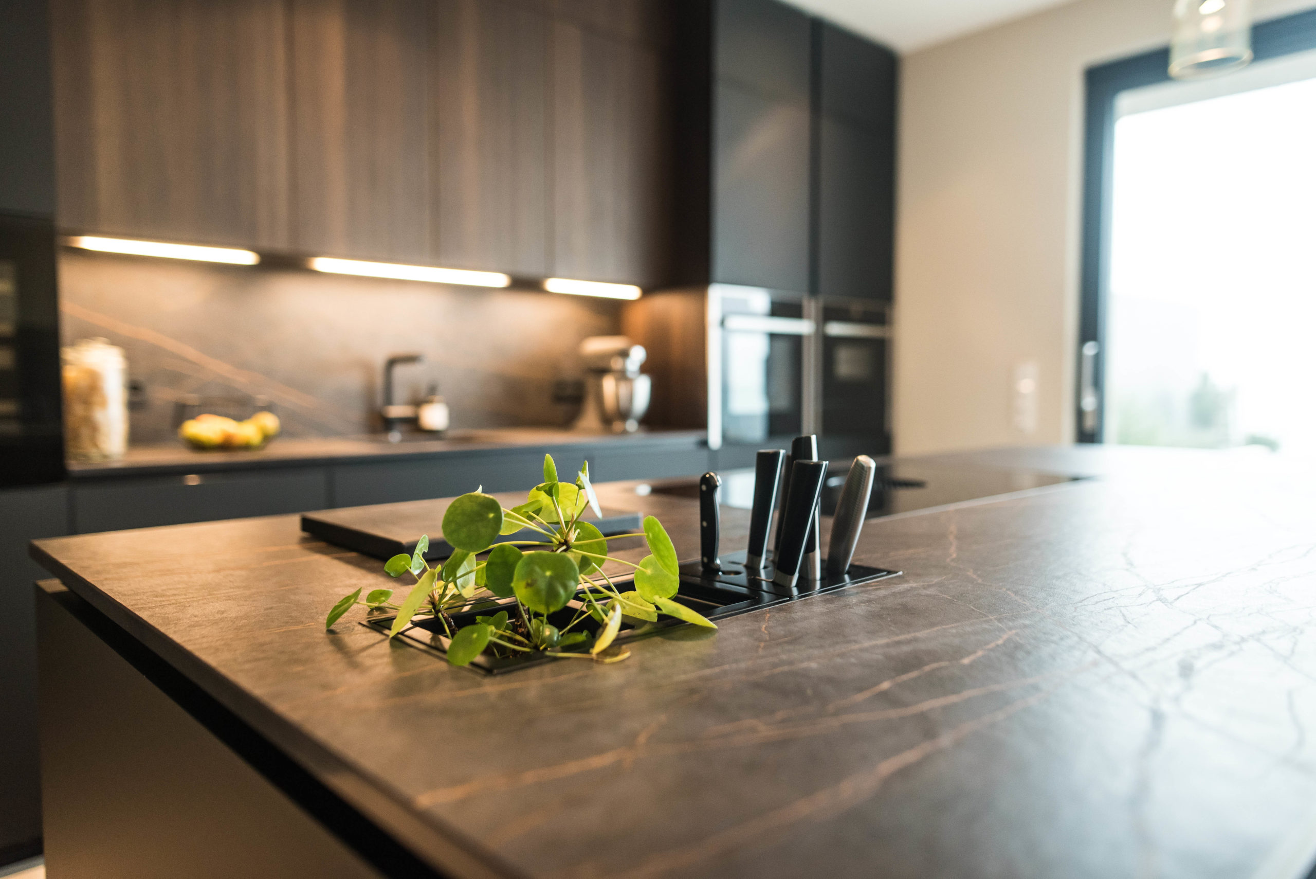 Petit détail technique, nous avons ajouté un linéaire d’accessoires directement intégré au plan de travail, celui-ci permet d’avoir directement à portée de mains par exemple couteaux, plantes aromatiques ou autres éléments culinaires.