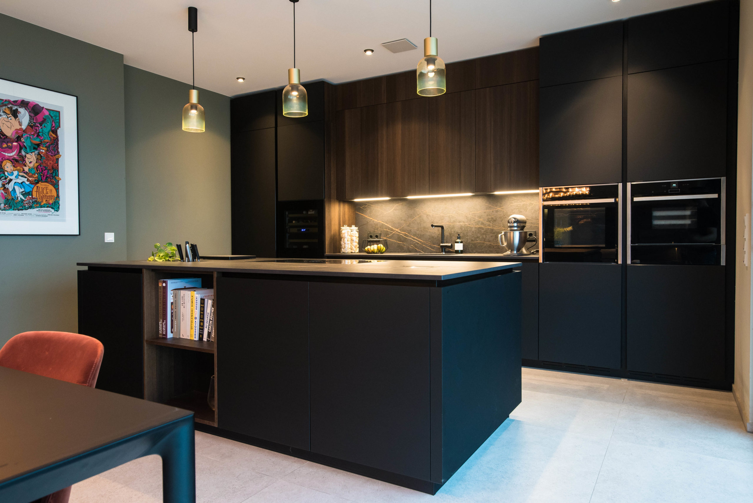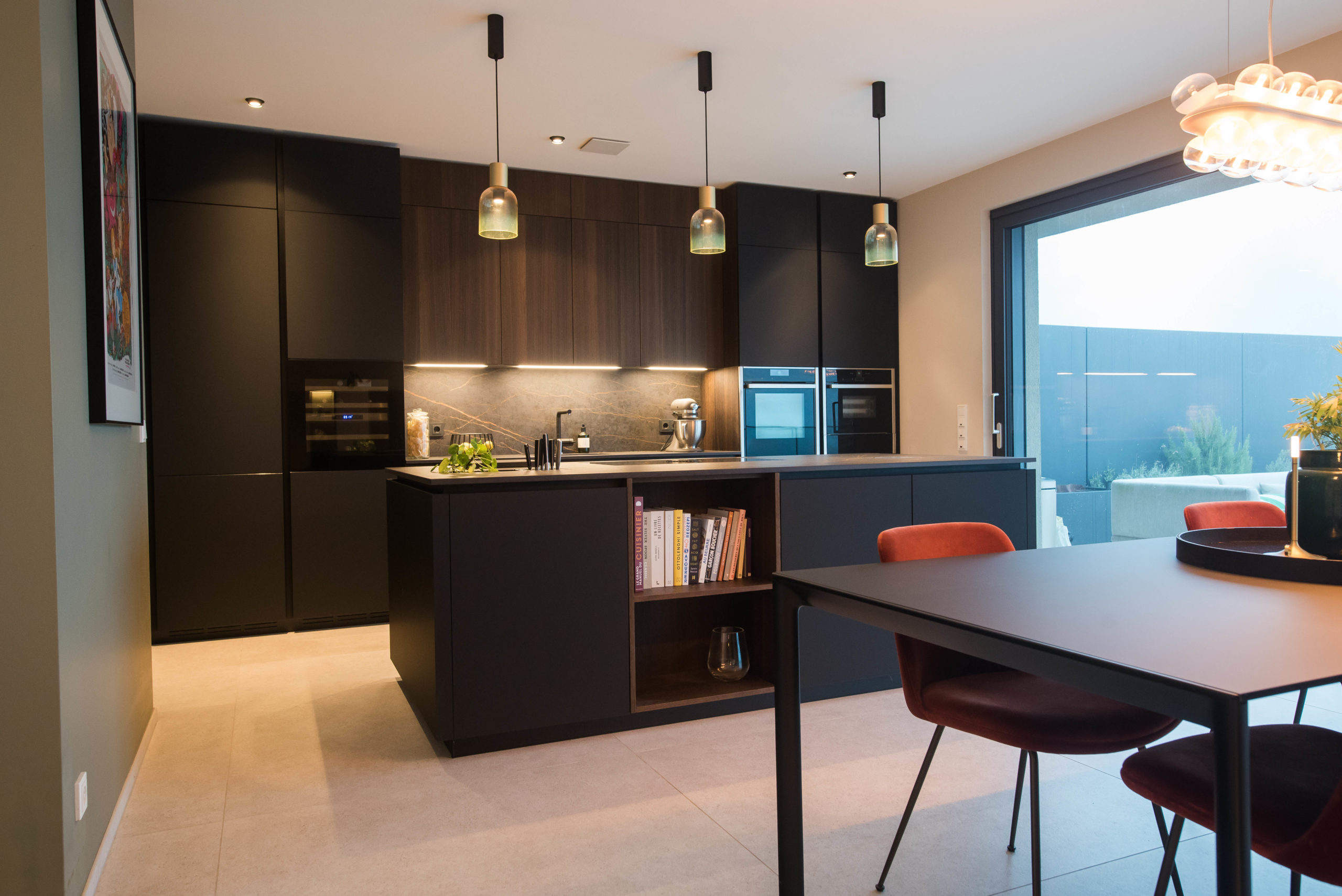 Il s’agit d’aménager la cuisine, la salle à manger et le salon. Pour répondre aux attentes claires et précises du client dont le choix de cette dominante noire était un parti pris, notre designer d’intérieur chez 1plus1 interior a pu laisser libre cours à son imagination et proposer toutes les possibilités de formes et de matériaux permettant d’obtenir le résultat attendu. Simplement il fallait garder en point de mire le fait que l’espace de vie dans sa globalité serait animé par ces meubles et leur agencement.