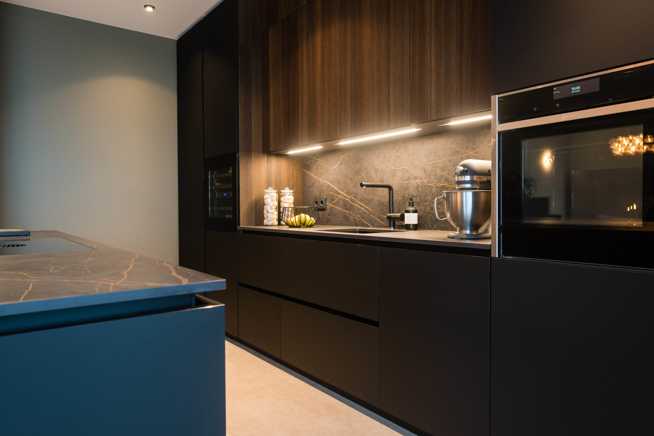 bois Termotratto des meubles hauts, la céramique Saint- Laurent inspirée des marbres noirs, le mur en béton et le sol en pierre dans l’esprit Terrazzo.