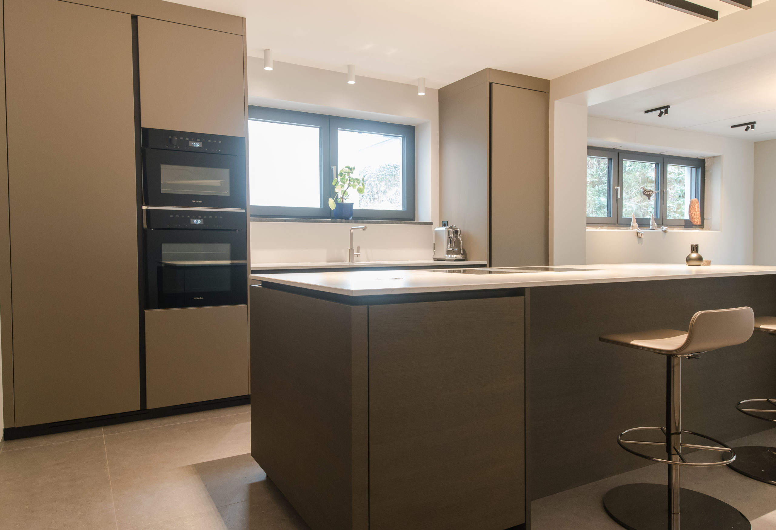 Le mobilier habille tout un pan de mur de chaque coté d’une grande fenêtre qui inonde de lumière la cuisine. Dans ce grand ensemble de mobilier, sans être chargé grâce à cette césure qui a permis d’installer l’évier et le lave-vaisselle, sont également intégrés les fours et des caissons de rangement de différentes formes et tailles. Un ilot central portant la plaque de cuisson, avec hotte intégrée, et une table de petit-déjeuner avec tabourets hauts, offre un trait d’union entre l’espace cuisine-technique et la salle à manger. Le plan de travail est un vrai partenaire du cuisinier, capable de recevoir des plats ou casseroles chaudes et servir de planche à découper.