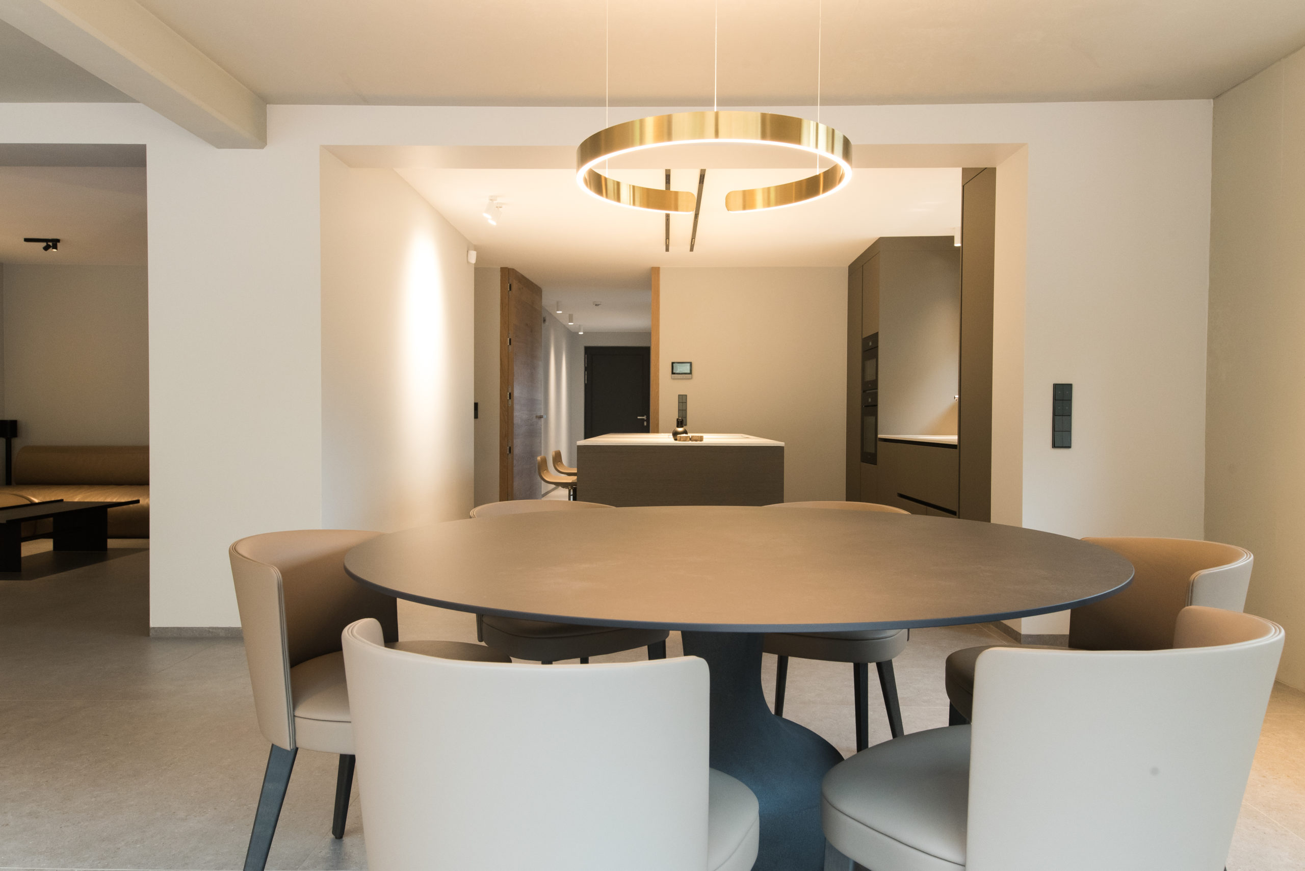 Ici, dans la continuité de la cuisine, le choix de rester sobre et pratique a dominé. La table, ronde
